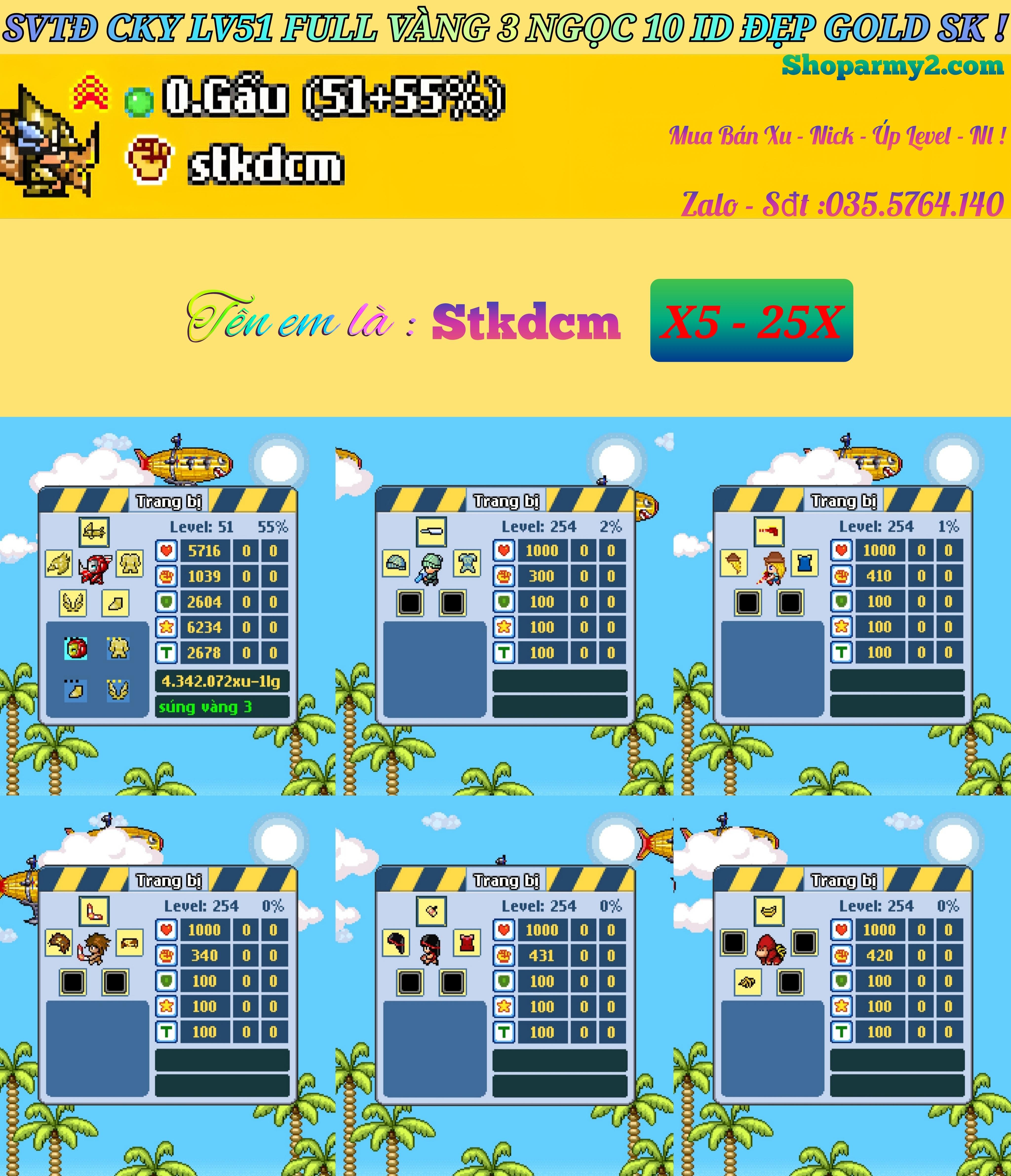 Nổi bật: Svtđ cky lv51 full vàng 3 ngọc 10 , 3tia lv254 , mgt lv254 , khỉ lv254 , tz lv254 , apa lv254 .